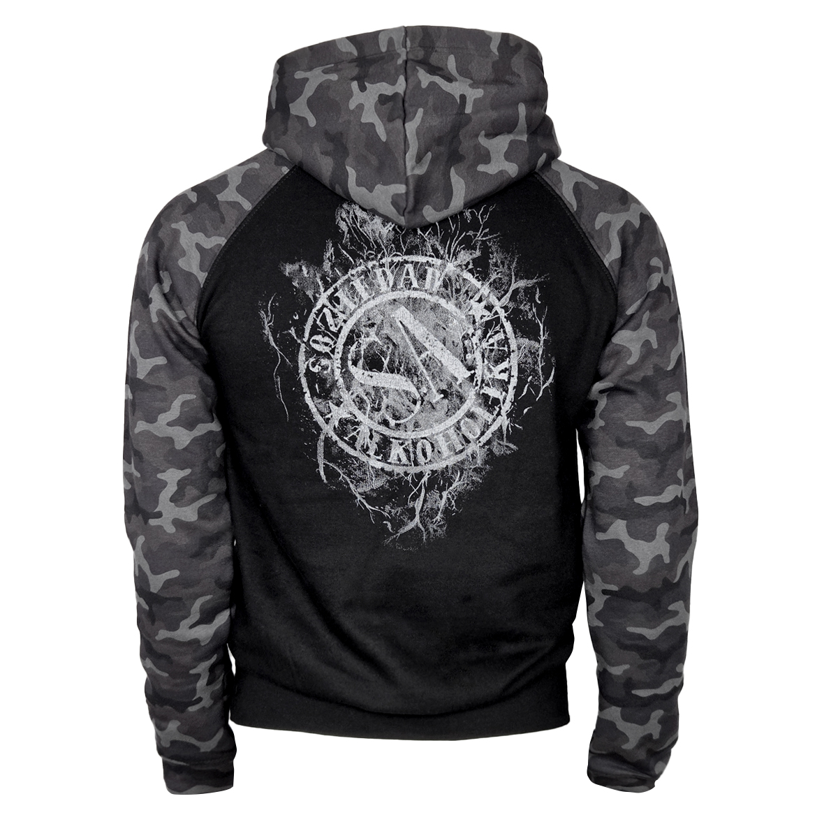 Mangas y capucha en camuflaje gris. Pecho y espalda en color negro.